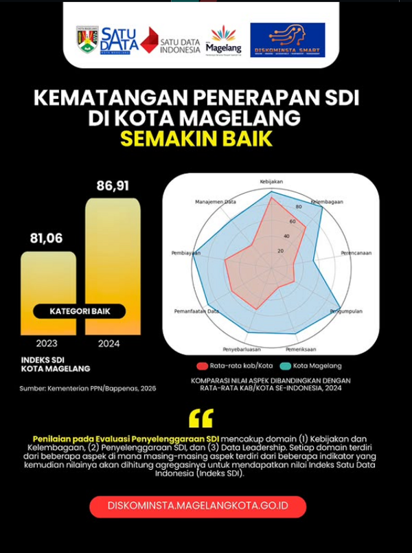 Sahabat Data,Puji syukur Kota Magelang kembali meraih kinerja baik, kali ini dalam implementasi Satu Data Indonesia (SDI). Indeks SDI hasil evaluasi Kementerian PPN/Bappenas naik dari 81,06 (kategori baik) menjadi 86,91 (kategori baik).