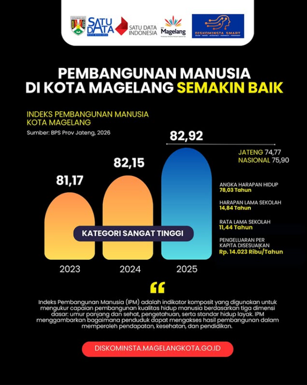 Sahabat Data,Kualitas pembangunan manusia di Kota Magelang terbukti semakin baik dari tahun ke tahun. IPM Kota Magelang di tahun 2025 mencapai 82,92 (kategori sangat tinggi), melampaui IPM Jateng (74,77) dan nasional (75,90).