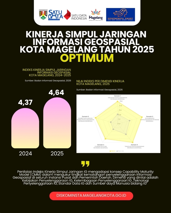Indeks kinerja simpul jaringan IG Kota Magelang mencapai angka 4,64 di tahun 2025. Pengukuran ini dilakukan oleh Badan Informasi Geospasial @infogeospasial pada dimensi Kebijakan Penyelenggaraan IG, Kelembagaan Penyelenggaraan IG, Teknologi Penyelenggaraan IG, Standar Data IG dan Sumber daya Manusia bidang IG.